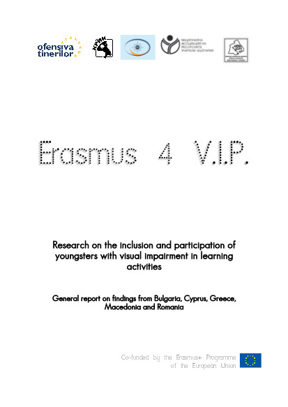 The “Erasmus 4 VIPs” project aimed to identify new ways in which youngsters with disabilities, especially with visual impairments, can get more involved in various social and educational activities. In order to achieve this objective, the project consortium, consisting of five partners from Romania, Greece, Bulgaria, Macedonia and Cyprus considered that first of all it was important to explore the real context of integration of young people with visual impairments. This would become the base on which we could later design powerful resources that youth workers and youth organizations can use to integrate young people with visual impairments in non formal education activities and international mobility.